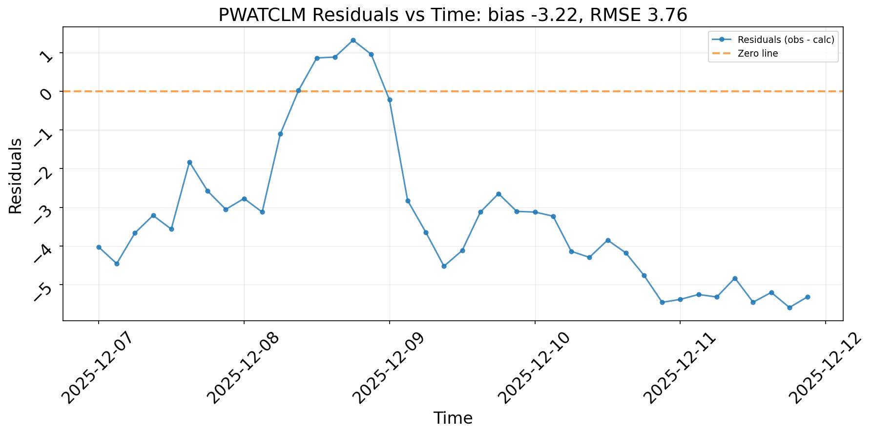 Time series of Precipitable Water residuals (observed minus calculated from 2-m dew point temperature) for 2025-12-07 to 2025-12-08.