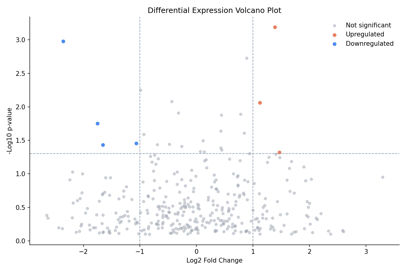 Scatter plot combining statistical significance (-log10 p-value) with effect magnitude (log2 fold-change) to identify differentially expressed genes or proteins.