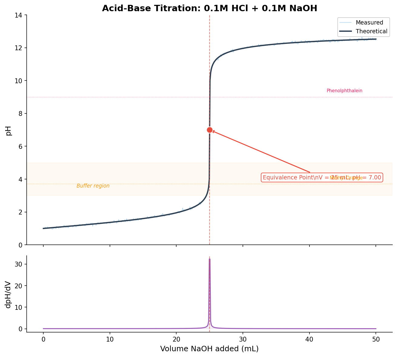 Plot pH against titrant volume to visualize acid-base titration with equivalence point and buffer region annotations.