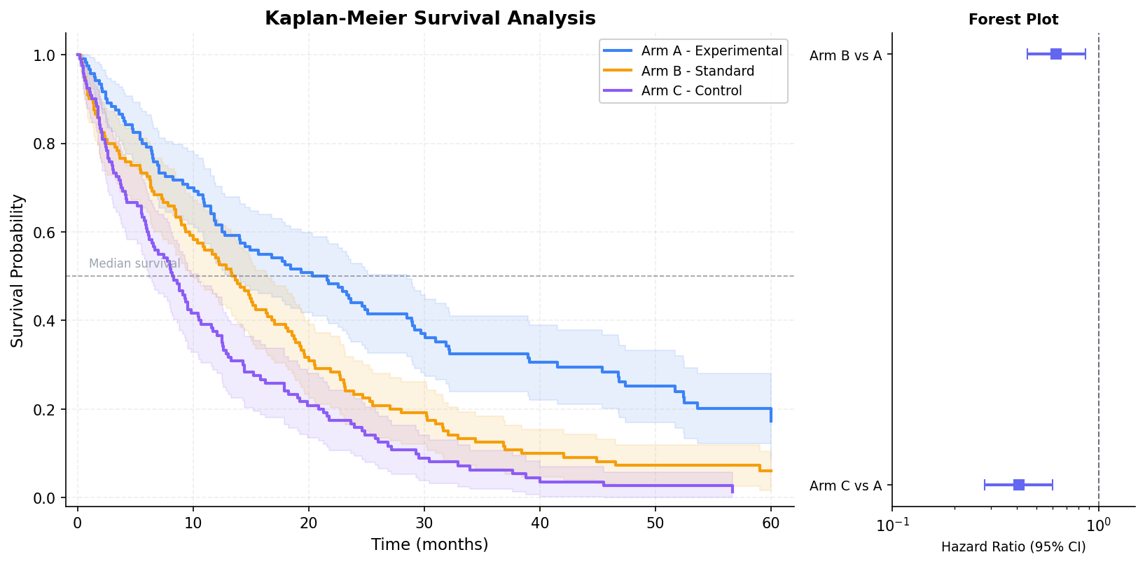 Step-function survival curves showing the probability of event-free survival over time, with censoring marks and confidence interval bands.