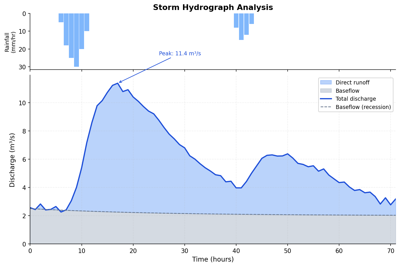 A dual-axis time series plot combining a streamflow discharge line with an inverted precipitation bar chart.