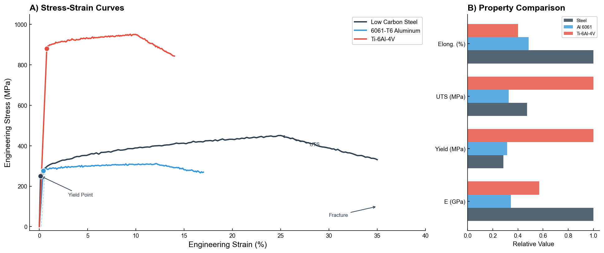 Displays mechanical stress versus strain from tensile testing, annotating elastic modulus, yield point, ultimate tensile strength, and fracture.