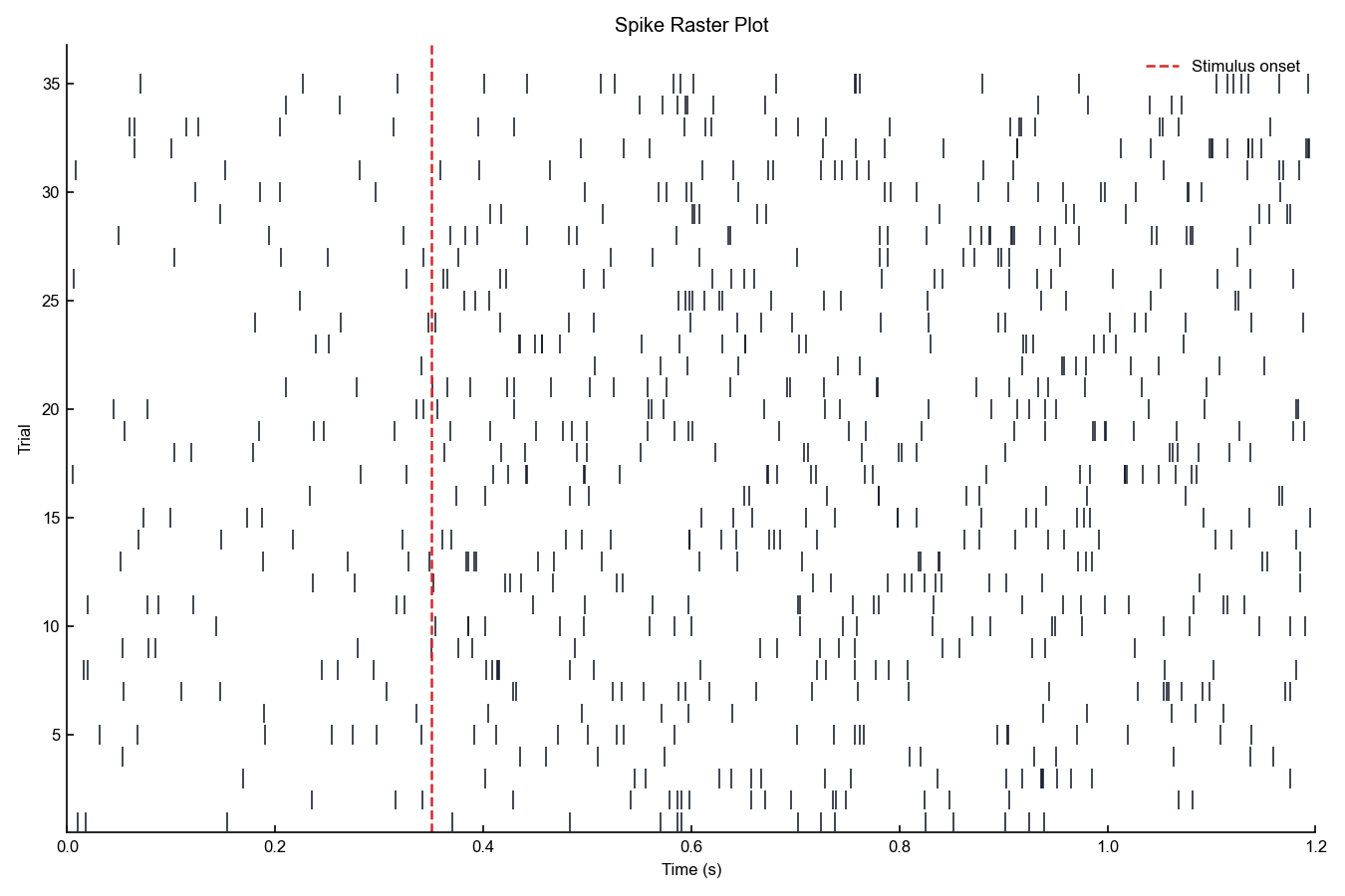 A dot-per-spike display of neural firing times across trials or neurons.
