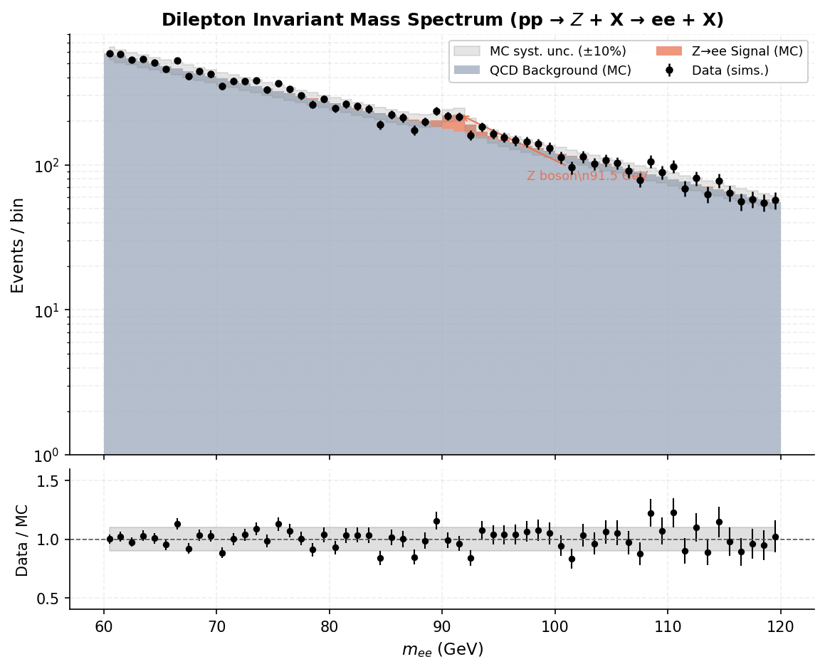High energy physics plots, ratio plots, and event displays.