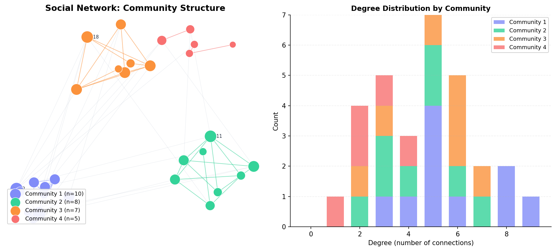 Network graphs, community detection, and relationship mapping.